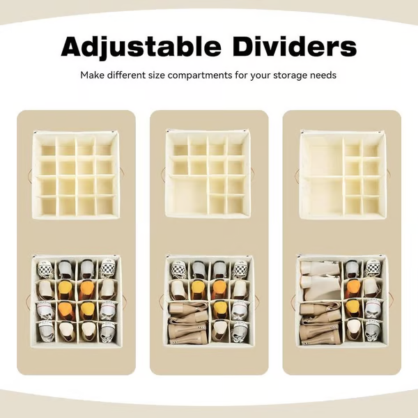 SOLIDE & DURABLE : La boîte de rangement pour chaussures est fabriquée à partir de matériaux de haute qualité et conçue pour durer. Le cadre et la base sont réalisés en carton épais et tissu Oxford haute densité, tandis que les séparateurs sont faits de panneaux alvéolés et de tissu non tissé, vous offrant une solution de rangement fiable.